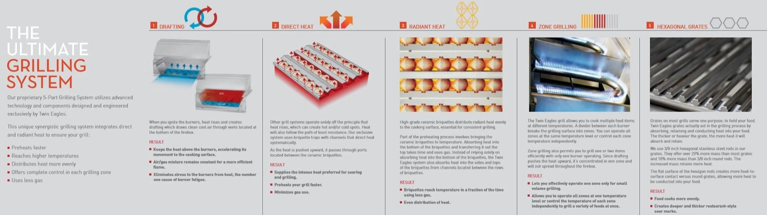 - 25,000 BTU burners, constructed of 14 gauge 304 stainless steel with lifetime warranty